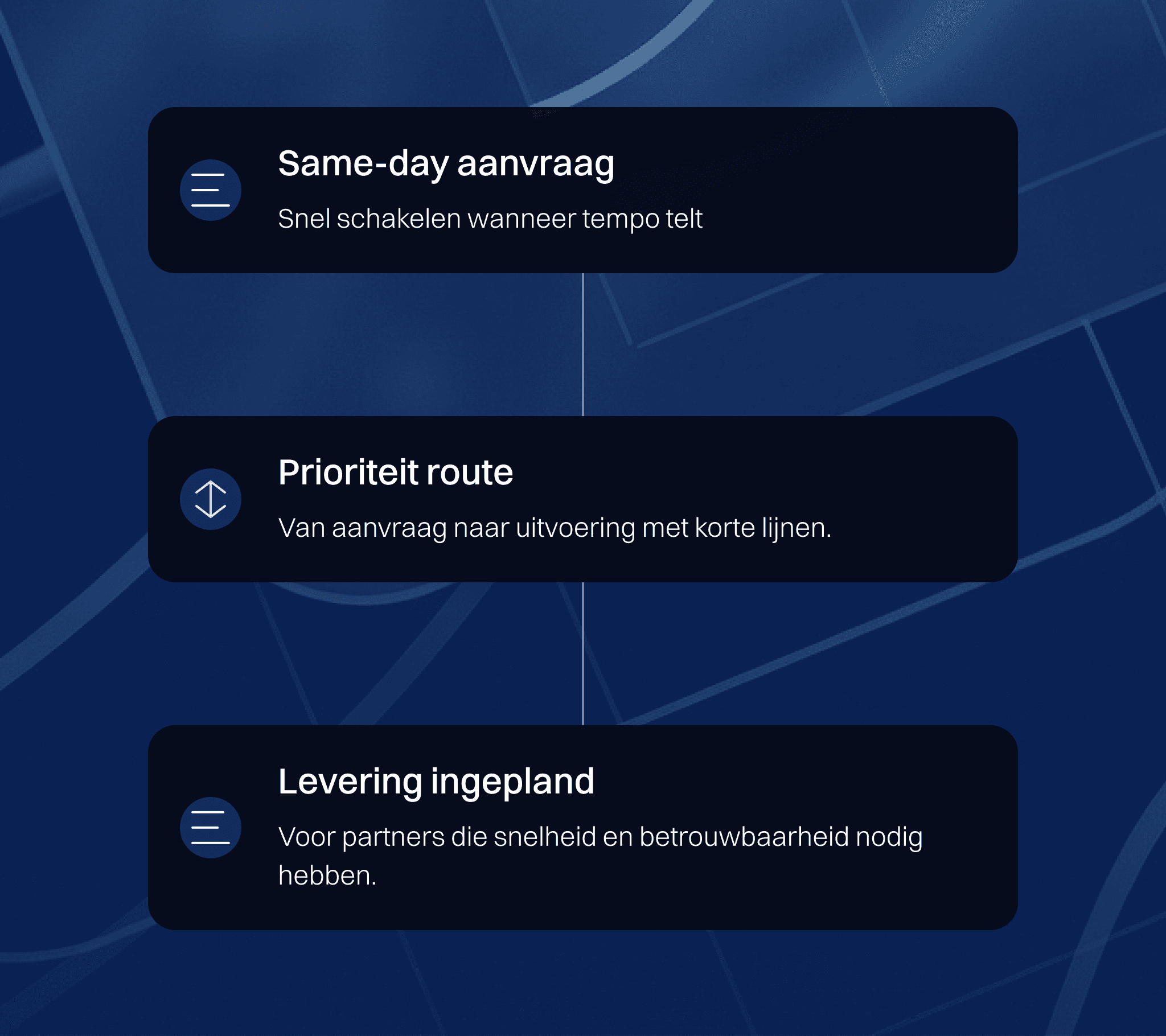 Voor opdrachten waar tempo telt ondersteunt HLS met same-day en next-day delivery, inzetbaar voor piekvolumes en tijdkritische stromen.